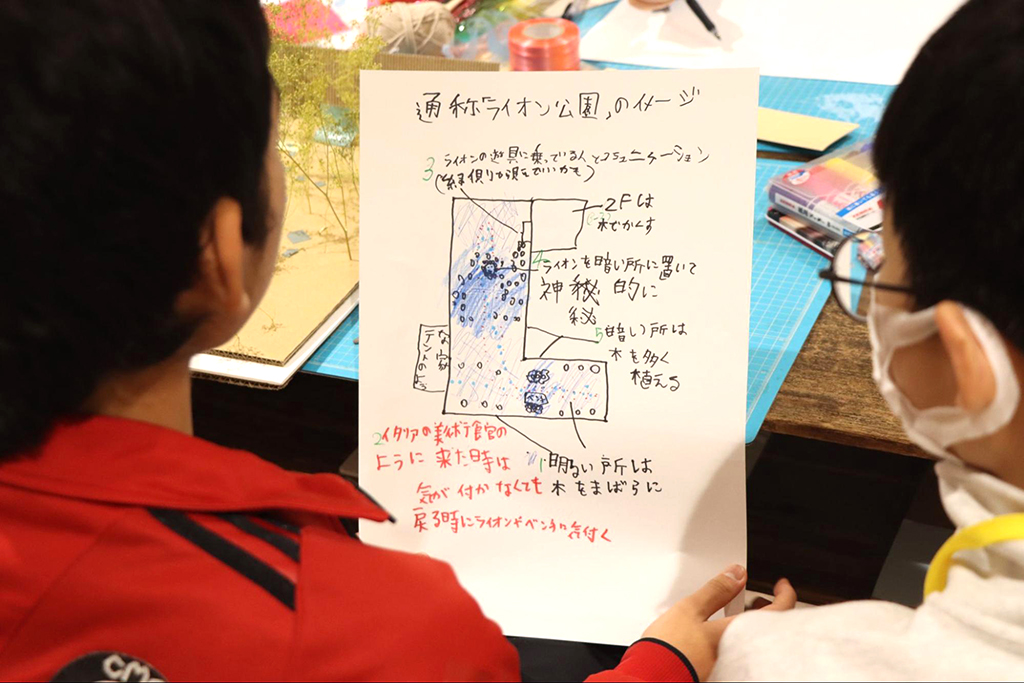 工夫したところや大切にしているところなど。小さな模型を手にしながら、1人1人が講師陣の前でアイデアを発表し、フィードバックをもらいます。自分で創意工夫をしていると、他の人の創意工夫も理解しやすくなります。他の生徒の発表にも耳を傾けていきます。