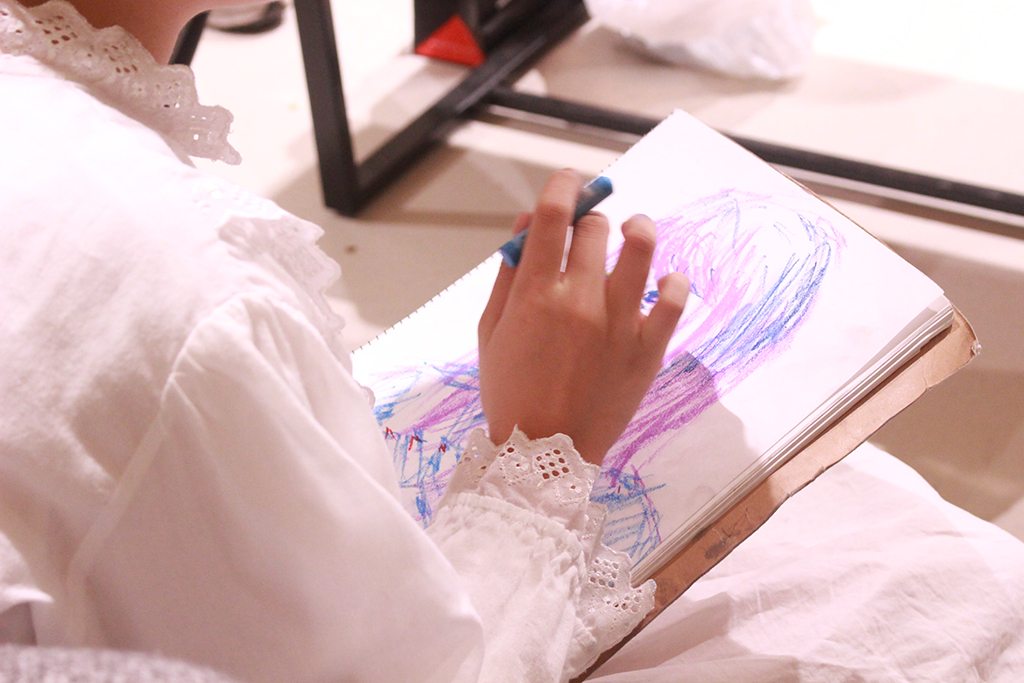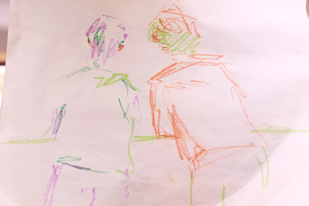 例えば、2人が向かい合って会話をし続ける発表。結論づけるよりも、話題が「散歩」のように転じながら広がっていきます。そして、そのうちの一人は、話に耳を傾けながらクロッキー帳に相手のポートレートを描き続けます。そして、会話の一端の終わりを感じる際に、そのスケッチが完成。話に必ず結論をつけてしまうクセに気がついて、そうではない話し方を模索しているなかで生まれたそうです。