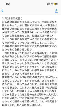 自分が大切にしているもの。そもそも、その大切にしているものを、自分自身が見ようとできているか。「散歩」を通した授業ではそのような着眼があったように思います。そして、発表を通して、それを他者に手渡せるか。手渡そうとしているのかということが問われていきます。今野さんは、「握れているものが必ずある。その手をひらくことができるか」とも言います。つまり、「観客」という存在の大切さが説かれていきます。「観客をどのように意識するかで、自分から出る音も決まる。観客に対して開いているかどうかも、その音から伝わってくる」と今野さんが伝えるように、観客という他者を迎え入れながらひらかれる、大切なものを大切なままにしあえる場のあり方へと意識が向かっていきます。