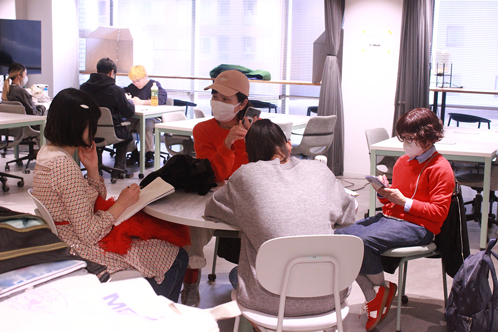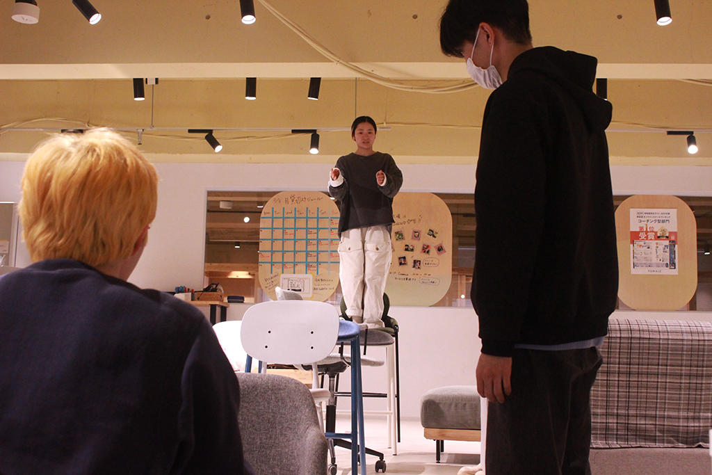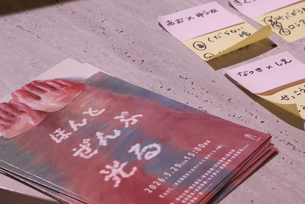 3月1日(日)、12回目の授業となる今回は、生徒が手がけた、月末に控える公演のチラシが完成。このチラシを置きたい場所や届けたい人。そんなイメージが広がっていきます。そして、今回もペアでの創作も重ねていきます。