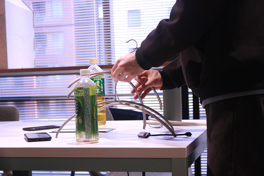 コミュニケーションといっても必ずしも言葉だけが用いられるものではありません。音を鳴らしてみたり、空間や身体を動かしてみたり、スペースに置いてあったハンガーなどの道具を並べてみたり。それが些細なことだとしても、なにかしら働きかけることで、自分や相手に変化や反応があることを確かめていくように時間を過ごしていきます。そのような「確かめ」は、今期のこのクラスの特徴であるようにも思います。