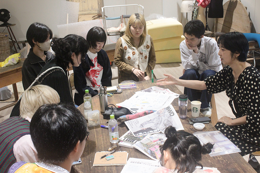 今回のゲスト講師には、編集者の向千鶴さんをお迎え。ファッションメディア「WWD」の編集統括を経て、現在は同メディアの「サステナビリティ・ディレクター」を務めています。当日は、向さんも「いとおしさを感じる一着」を纏って登壇。生徒の皆さんとの会話も弾みます。ご自身の物語とともに生徒の皆さんの物語をさらに深掘りする問いを投げかけつつ、「サステナビリティ(持続可能性)」と向き合うことになった経緯が紹介されます。その中では、ファッション業界が抱える社会に対して抱える課題、そして、それを体感したご自身の意識の変化も語られます。