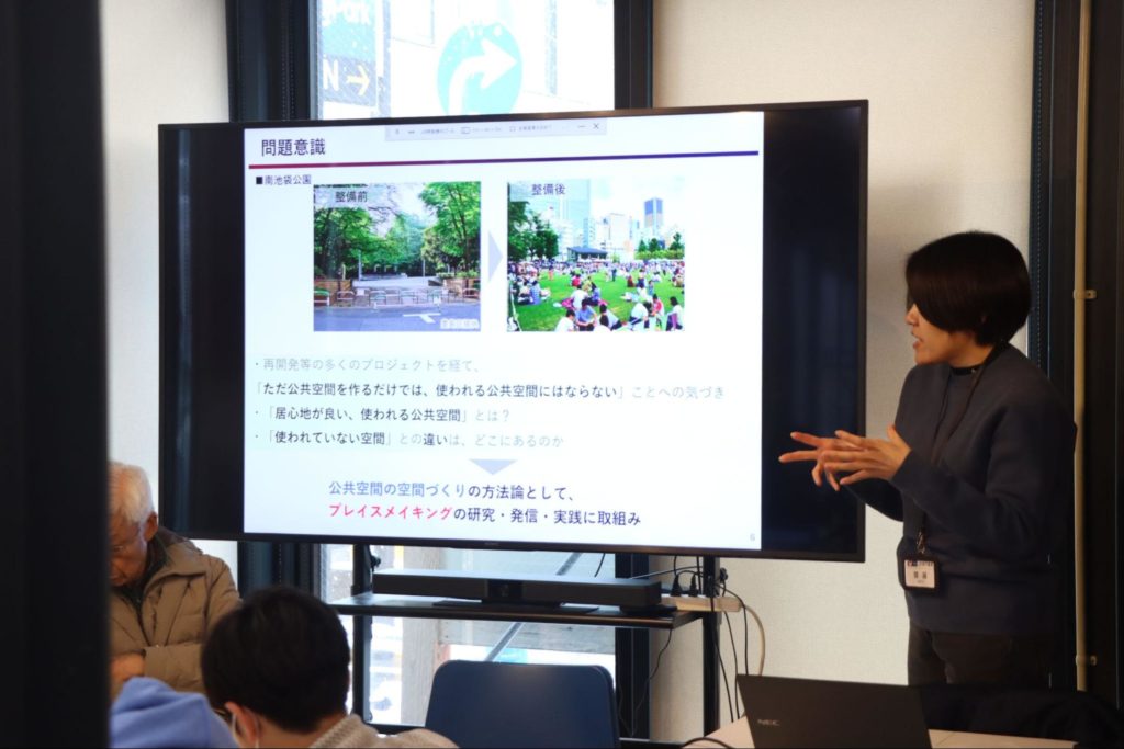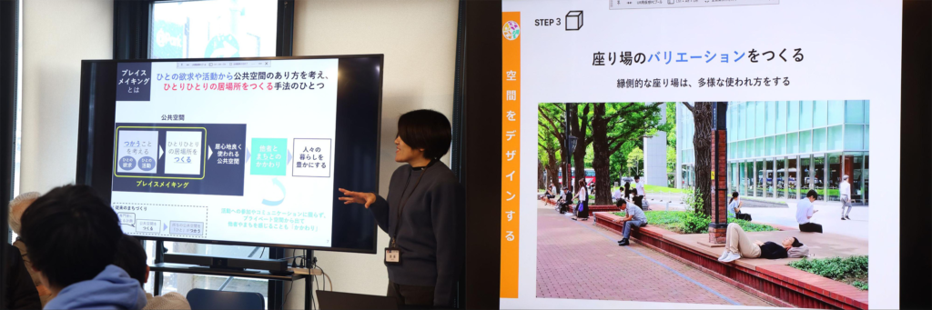 さらに、まちづくりの別の観点として、URで実践されている「プレイスメイキング」という考え方が紹介されます。「人の行動や活動のリサーチを通して公共空間の場の多様なあり方や使われ方を考えていくということを『プレイスメイキング』として捉えて実践しています。例えば、単に『座る』といっても色んな座り方があるし、色んな時間の過ごし方がある。そういうバリエーションを豊かに見ていくこと。そのようなことから居心地の良い公共空間を考えていくことは、皆さんがまさに今取り組まれている『私とみんなの居場所』というテーマとも重なる部分が多くあるんじゃないかと思います」と、斎藤さんは言います。