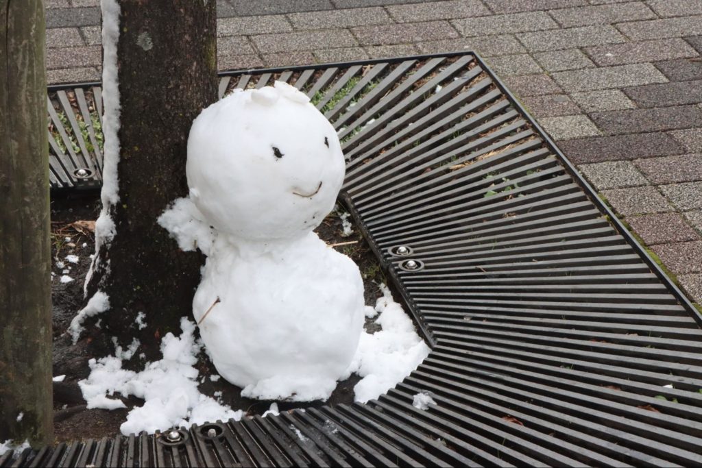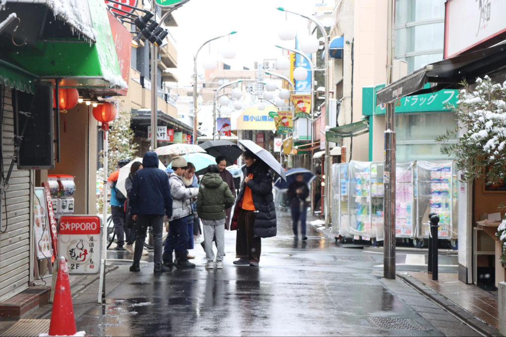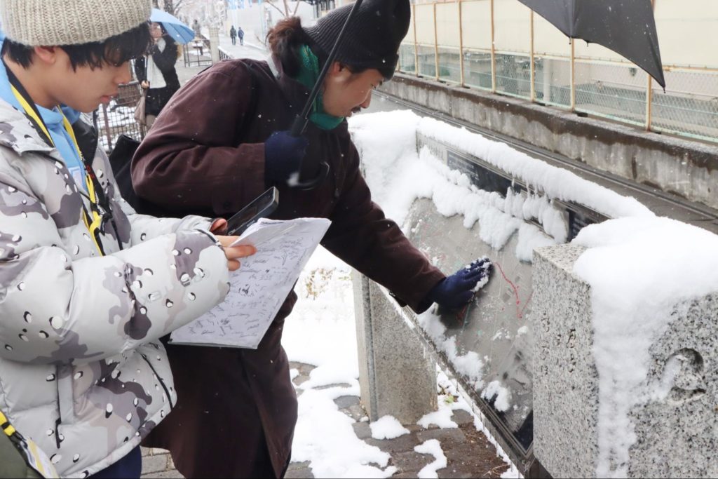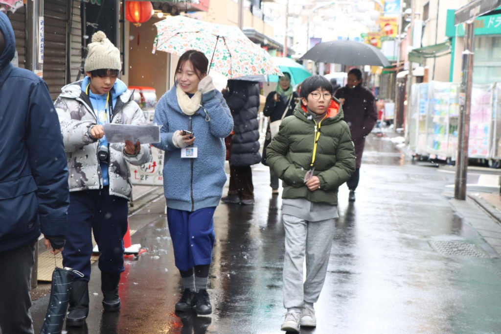 授業の後半では、それぞれにフィールドワークを進めていきました。前日から降雪があり寒い1日でしたが、街の至る所で雪だるまを発見したり、地域のお店の方が軒先で雪かきをしていたり、広場で子どもたちが楽しそうに遊んでいたりと、普段と異なる街の風景や人の様子に新たなインスピレーションも生まれていきました。
