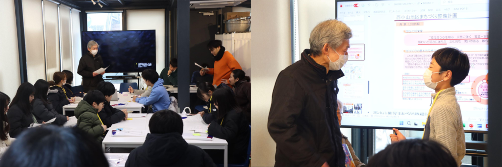 レクチャーを踏まえつつ、生徒の皆さんからは、「再開発で新しく建つ建物はどれも高い。なぜ高いビルを建てなければいけないんですか?」「公園の管理や運営をする地域住民をどうやって募るんですか?みんなでどんな会話をしているんですか?」「公園と商店街が今後どのような関係になっていったら良いと思いますか?」と、様々な質問が寄せられます。生徒の皆さんそれぞれがレクチャーの内容と自分の構想とを照らし合わせて考えながら、街への考察を深めている様子がとても印象的でした。